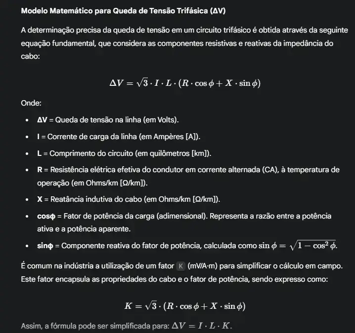 - Frequência do Sistema: A reatância é diretamente proporcional à frequência (XL=2πfL). Os valores tabelados são tipicamente calculados para 50 Hz. Para sistemas operando em 60 Hz, a reatância deve ser multiplicada por um fator de 1,2 (ou seja, 60/50), o que impacta diretamente o valor final da queda de tensão, especialmente em circuitos com baixo fator de potência.