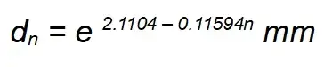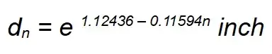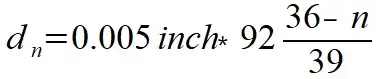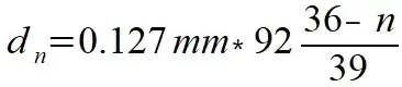 O diâmetro exato (d_n) de um fio de um determinado número AWG (n) pode ser calculado pelas seguintes fórmulas: