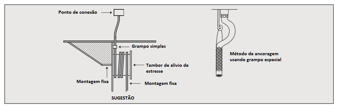 Наиболее распространенными точками якоря мебели являются терминалы «кабельные ручки». Нагрузка напряжения должно быть распределена по всей длине кабеля от 20 до 25 x его общего диаметра. Чтобы поддерживать эксплуатационные движения, оставьте кабель оставшимся перед входом терминала. Когда центральный внутренний аксессуар установлен, вертикальное расстояние между входным ртом и направляющим крана не должно быть менее чем в 15 раз превышать общий диаметр кабеля или 1 м, используйте самый высокий. Не менее 2 поворотов кабеля должны быть сделаны вокруг фиксированного барабана рельефа, чтобы обеспечить достаточную площадь контакта для надлежащего напряжения.